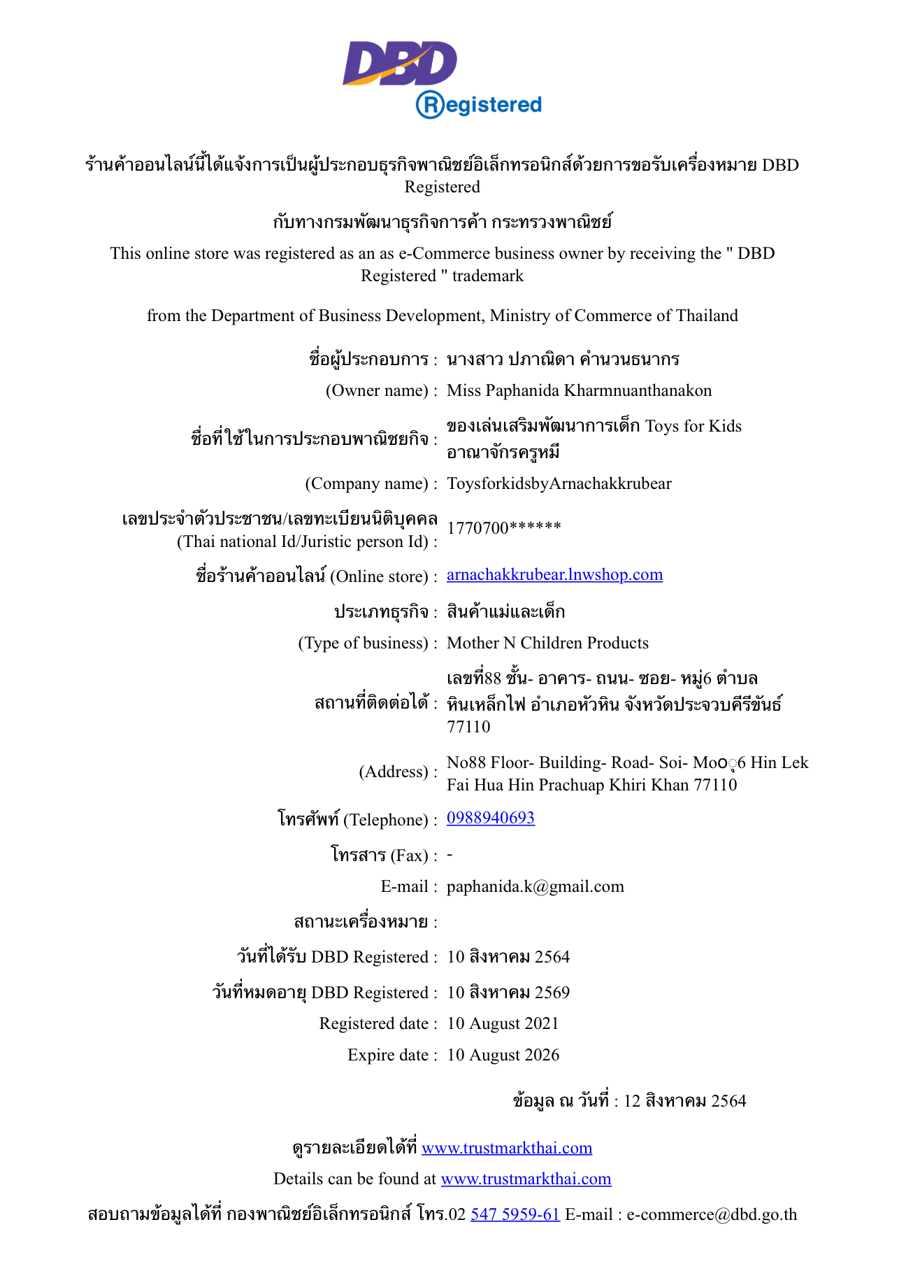ขออนุญาตเรียนให้ลูกค้าที่น่ารักทราบว่า ทางร้านเลยสร้างตัวตนโดยการลงทะเบียนพาณิชย์การค้าออนไลน์เป็นที่เรียบร้อยแล้วทั้ง 2 ช่องทางการจำหน่ายนะคะ 😊